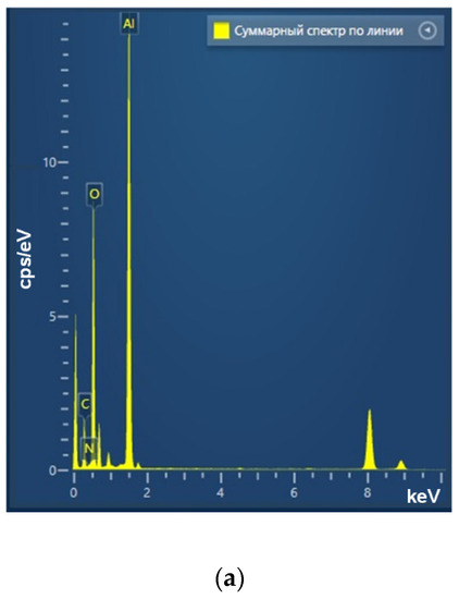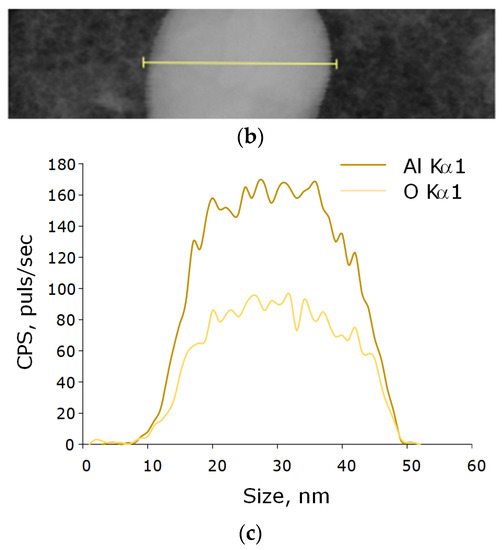 Using the laser ablation method, the aluminum oxide nanoparticles were obtained. These nanoparticles had an average size of about 50 nm, confirmed with DLS and CPS; ζ-potential of the order of 50 mV, which indicates the stability of the colloidal solution; the optical absorption spectrum of the nanoparticles made it possible to establish that the obtained colloidal solution contained Al2O3; using TEM, it was found that NPs had a spherical morphology (Figure 2a–d). As a result of energy dispersive X-ray spectroscopy (EDX) analysis, it was shown that the obtained aluminum oxide nanoparticles had the required chemical purity and did not contain impurities (Figure 3a–c).