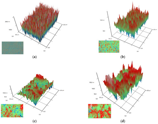 Images of the surfaces of polymer/Al2O3 -NPs composite coatings with different dopant content (PTFE without NPs (a); 0.001 wt% (b); 0.01 wt% (c); 0.1 wt% (d)) obtained using modulation interference microscopy. X- and Y-axis surface size (µm); Z-axis surface topography (nm). The image in the lower left corner for each figure is the image above, showing the distribution of the dopant in the matrix.