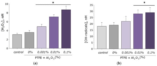 Results of evaluating the effect of PTFE/Al2O3-NPs on the formation of hydrogen peroxide (a) and hydroxyl radicals (b). *—statistically significant differences compared to the “control” group (without sample), (p < 0.05). Data are presented as the mean ± standard error of the mean.