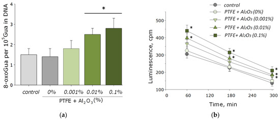 The effect of PTFE/Al2O3-NPs composites on the formation of 8-oxoguanine in DNA (a), as well as on the dynamics of the formation of reactive long-lived forms of proteins (b). *—statistically significant differences compared to the “control” group (without sample), (p < 0.05). Data are presented as the mean ± standard error of the mean.
