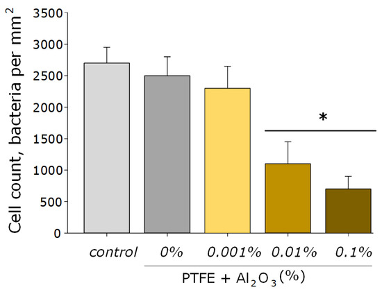 The microbiological study of the obtained PTFE/Al2O3-NPs composites containing various dopant concentrations in relation to E. coli. *—statistically significant differences compared to the “control” group (without sample), (p < 0.05). Data are presented as the mean ± standard error of the mean.