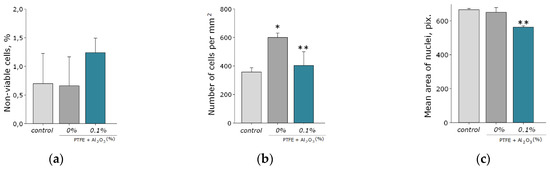 Another important property of Al2O3-NPs is low cytotoxicity compared to other nanomaterials based on metals and metal oxides, which is confirmed in a number of experimental research studies [28,66,67]. In this study, the analysis of cytotoxicity of the obtained PTFE/Al2O3-NPs with a high content of Al2O3-NPs (0.1 wt%) showed that the coating did not affect the growth and development of mouse fibroblast cells in vitro; it was revealed in the absence of differences in the count of non-viable cells, as well as the density of cultures, which were kept at the level of “control” values (Figure 9a,b). The percentage of PI-positive cells in the “PTFE/Al2O3-NPs 0.1%” group was 1.23 ± 0.25% (Figure 9a). The density of cells growing on the composite coating also did not differ from the control group and it was 404 ± 97 cells/mm2. The cells growing on the composite coating did not form a solid monolayer, they were located diffusely and formed local clusters. It was also found that on the surface of PTFE without nanoparticles, the number of cells was higher compared to the PTFE/Al2O3-NPs composite material (Figure 9b). This effect is possible due to the good adhesive characteristics of PTFE for a number of cells [68,69] and also due to uneven distribution of cells on the surface. It is known that PTFE is a non-toxic material used for medical devices covering [70]. Additionally, it has been found a slight decrease in the average area of the nuclei of cells growing on the surface of the PTFE/Al2O3-NPs coating (Figure 9c). Currently, the exact mechanisms of changes in the size and shape of the nuclei, as well as the physiological consequences of these processes, are poorly understood [71]. On the one hand, this may be due to chromatin condensation because of the proliferation activity of cells. On the other hand, chromatin compaction may precede apoptosis in some cells [72]. Thus, the surface of the obtained PTFE/Al2O3-NPs composite coating containing 0.1 wt% Al2O3-NPs did not interfere with adhesion, growth, and normal development of primary cell cultures of mouse fibroblasts for 3 days.