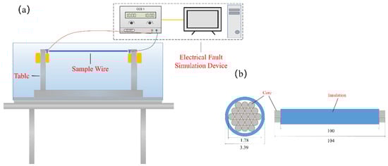 Schematic of the experimental apparatus: (a) electrical fault simulation device and (b) sample wire.
