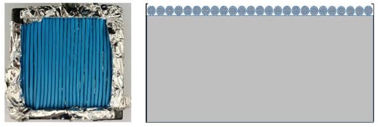 The fire characteristics of unenergized sample wires was measured and examined by a cone calorimeter from TESTech Instrument Technologies Co., Ltd., Suzhou, Jiangsu Province, China. The cone calorimeter is a small-scale calorimeter that is widely used to investigate fire characteristics of solid combustibles. Numerous flammability parameters, such as TTI, HRR, mass loss, and emission gases, can be obtained using this cone calorimeter method based on oxygen consumption. For the fire characteristic of electric wires and cables, this method is reliable and exhibits excellent reproducibility and repeatability. Studies have been conducted to evaluate the fire characteristics of electric wires [,], and the bench-scale results from a cone calorimeter have been verified to correlate with the results from large-scale fire tests. The experiments were based on the ISO 5660 standard [], and the sample wire was cut into pieces with a length of 10 cm. As shown in Figure 3, 25 pieces of sample wires were placed in parallel on the sample holder (10 cm × 10 cm × 10 cm). Thus, no space existed between each piece. The horizontal surface holding the sample wire was elevated nearly up to the top edge by mineral wool in the sample holder and coated with silver paper to ensure that all sample wires could be uniformly heated. External heat fluxes of 25, 30, 35, 40, and 50 kW/m2, which are typically encountered in fires, were tested. To ensure the accuracy of the experiments, two parallel experiments were performed for each group of experiments.