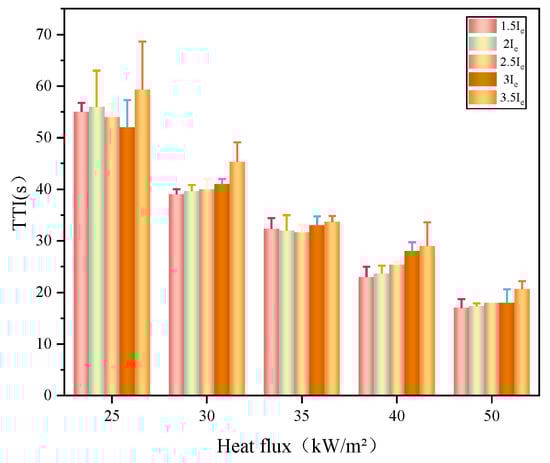 The ignition of solid materials is critical for fire spread and growth. The TTI is a critical parameter for evaluating the difficulty degree for some solid materials to be ignited. The TTI results of wires overloaded at 1.5, 2, 2.5, 3, and 3.5 Ie are shown in Figure 4 and Figure 5. The TTI is inversely related to the external heat flux. The average TTIs corresponding to 1.5, 2, 2.5, 3, and 3.5 Ie were 55, 56, 54, 52, and 59 s, respectively, at the heat flux of 25 kW/m2. When the external heat flux increased to 50 kW m−2, the average TTI decreased by 17, 17, 18, 18, and 20 s, respectively. Thus, the external heat flux intensity considerably influenced the ignition characteristics of PVC insulation. At high radiation intensities, the thermal decomposition of PVC was accelerated. After the material was heated by the external heat flux, it decomposed to produce combustible gases, such as H2, CH4, and C2H4 [], which were ignited by the intermittent arcing and eventually generated a continuous flame. These results illustrate that wires overloaded at 3.5 Ie exhibit higher TTI values than other wires overloaded at lower current values. Under the same heat conditions, the TTI value of the wire subject to a higher overload value before is greater than that of the wire with a smaller overload value because the active composition and structure of the PVC insulating layer undergo chemical changes under Joule heating from the copper core when the wire is overloaded. The TTI variation of PVC copper wires induced by overload is analogous to that of thermal aging PVC copper wires. According to previous studies [], the increase of TTI is attributed to chain breakage, HCl emission, and plasticizer volatility or decomposition, which lead to elevated hardness and brittleness.