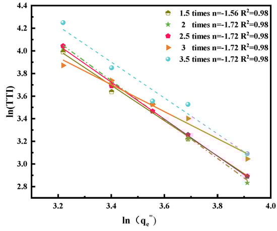 When the index n is higher, igniting the sample becomes difficult. Index 2 is critical for distinguishing the thermal thick sample from the thin sample [,]. The linear relationship between and is presented in Figure 6. Index n is between 1.19 and 1.72, which is a thermal thin material. Because of the minimum value of the wire overloaded three times Ie at 25 kW m−2, index n is the minimum among all wires overloaded at various currents. The TTI values depend on the flammability properties of insulation materials, which imply chemical–physical change during the internal heating of the thermal core. Because of the similar index and the nearly coincident line of wires overloaded with 1.5, 2, and 2.5 Ie, the physical–chemical properties exhibit considerable alteration.