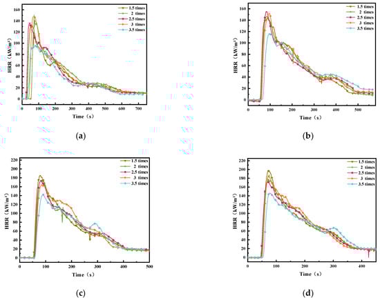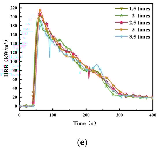 HRR for the wires at various external heat fluxes. (a): 25 kW m−2; (b): 30 kW m−2; (c): 35 kW m−2; (d): 40 kW m−2; (e): 50 kW m−2.