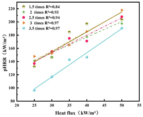 Figure 7 illustrates the HRR curves of overloaded wires carrying various currents exposed to various external heat fluxes. The outer surface layer of PVC insulation is the first component of decomposition. When the wire is ignited, the HRR increases immediately to a peak (pHRR) and subsequently decreases progressively over a few hundred seconds. For the overloaded wire, the thermal degradation of PVC insulation occurs from the inside to outside because of the heating of the internal copper core. Therefore, when the current flowing in the wire is low, then sufficient Joule heat cannot be generated to initiate the chemical–physical change of the outer surface layer. Figure 8 shows the pHRR curves of wires subjected to different overload currents. With an increase in the heat flux, PVC polymer decomposition is accelerated, which results in an increase in the HRR value and an increase in pHRR. As indicated in the pHRR curves of 1.5, 2, 2.5, and 3 Ie, these wires damaged by various currents require nearly the same time to reach at pHRRs, which are approximately identical. Similar to the thermal aging PVC copper wire [,], the wire overloaded at 3.5 Ie requires more time to increase its pHRR, which is lower than that of other overloaded wires exposed to various external heat fluxes. This result likewise indicates the 3.5 Ie flowing through the PVC copper wires can deteriorate the active composition and structure of polymer insulation materials.