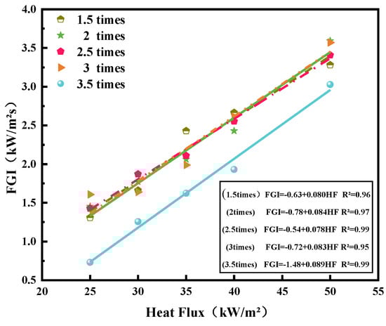 where is the time to pHRR (s). Thus, the unit of FGI is kW m−2 s. Table 3 presents the specific values of the pHRR, , and FGI in two parallel tests. Figure 9 presents the profile of FGIs of various overloaded wires exposed to various external heat fluxes. The FGI of 3.5 Ie overloaded wires is constantly less than that of other overloaded wires. The FGI linear lines of wires overloaded with 1.5, 2, 2.5, and 3 Ie are nearly coincident under various external heat fluxes. This result illustrates that the PVC wire carrying less than three times Ie for one hour cannot accelerate the flame spread through the wire, but the flame spread and size may decrease with the overcurrent elevated continuously. The FGI of 3.5 Ie overloaded wires decreases considerably, but the FGI of wires with less than three times Ie overloaded wire is stable. Like the results of previous study [], the FGI of copper wires decreased due to more deterioration of polymer insulation materials, as the exposure intensity of the heat source increased. This result can be attributed to an increase in the currents, which increases the temperature of the copper core, deteriorates the composition and structure of PVC insulation, and reduces the fire hazard of PVC copper wires.