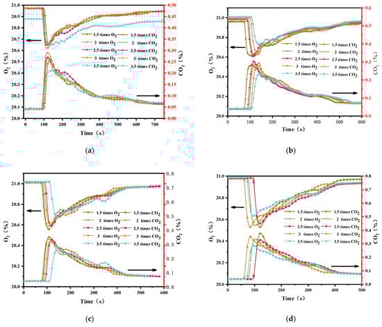 During burning, oxygen (O2) [] in the ambient air is consumed and gaseous combustion products are released. Major species concentrations and emission yields were continuously tracked and measured using a Ttech-16172 Gas Analyzer. The concentration and production of carbon monoxide (CO) [,] are low and difficult to observe and therefore ignored. Figure 10 shows the evolution of gas emissions during external flux testing in the range of 25 to 50 kW m−2. The consumption of O2 exhibited a trend of first decreasing and subsequently increasing with the increase of time, and the production of CO2 [] exhibited a trend of first increasing and subsequently decreasing. The time to reach the peak is similar to the time to reach pHRR. The larger the external heat flux is, the greater the amount of CO2 produced by the solid carbon is. The overload current also affects the consumption of O2 and the production of CO2. When the external heat flux was 35 and 40 kW m−2, the consumption of O2 and the generation of CO2 of wire overloaded with 1.5 Ie reached the maximum, which indicated the combustion was most sufficient. For the overload current, the trend of the CO2 generation was similar to that of HRR. Furthermore, the generation of CO2 from 3.5 Ie overloaded wires was the minimum among all tested wires regardless of various heat fluxes. As the heat flux increased, the value of CO2 generation of 3.5 Ie overloaded wire tended to equal those of other overloaded wires.