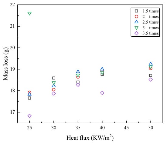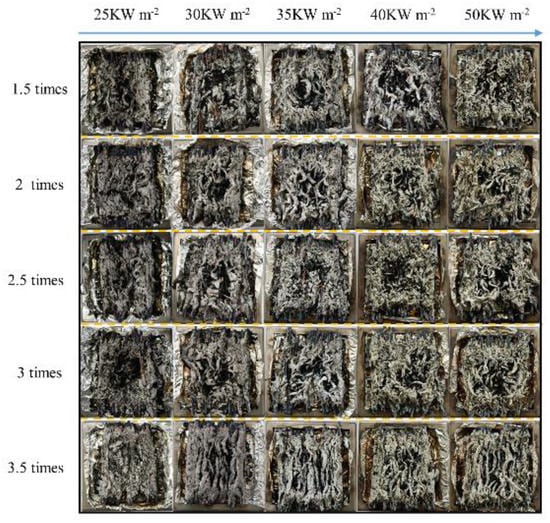 After the burning stopped, a large amount of residue remained from the PVC wires. The mass loss of residue was between 16.8 and 21.6 g, as shown in Figure 11. With the external heat flux increasing, the mass loss increased. The mass of residues left for 3 Ie overloaded wire at 25 kW m−2 was the largest among all tested overloaded wires, which is consistent with the results analyzed in Section 3.1. Under all external heat fluxes [,], the mass loss fraction of 3.5 Ie overloaded wire stably remained the least compared with that of other overloaded wires. Besides the 3.5 Ie overloaded wire, the mass loss fractions of other overloaded wire were close and simultaneously become closer as the heat flux elevated. Figure 12 shows images of burning residues under various heat fluxes. These residues are similar but differ slightly in appearance. For wires overloaded with 1.5, 2, 2.5, and 3 Ie, the lines of each wire in residues cannot be observed, but the lines in 3.5 Ie overloaded wire residues are visible. This result indicates that the intensity of 3.5 Ie overloaded wire combustion is less than that of other overloaded wires.