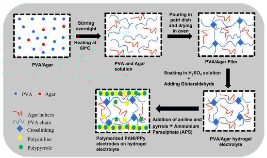 To prepare the hydrogel electrolytes, 5 mL of 5 wt.% PVA solution was added in four beakers. Then, in these PVA solution containing beakers, 3 mL of 5 wt.% Agar solution was added in two beakers and 5 mL in other two beakers. All four beakers were kept on magnetic stirring at a temperature of 60 °C overnight so that PVA and Agar can be thoroughly incorporated into each other. The following day, all the four beakers were emptied in four different petri dishes which were then placed in a conventional oven for the solvent evaporation at 50 °C for 1 h. After the solvent evaporation, quite stable hydrogels were developed in which 2 mL of 1 M H2SO4 was added in each petri dish. Then, 1 mL of 4 wt.% Glutaraldehyde (GA) as a crosslinking agent was added in all the four petri dishes to form the hydrogels. The petri dishes were then covered with a parafilm. Polymers in their natural state do not show conductivity; therefore, the added sulphuric acid acts as a catalyst and a charge carrier. Glutaraldehyde is used because it favors intermolecular reaction with PVA and can crosslink the polymers. After few minutes, thin hydrogel films were formed which served as electrolytes. The synthesis steps are given in Figure 1.