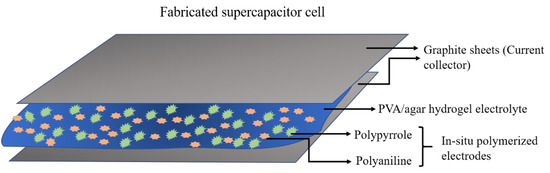 For the in situ polymerization of aniline and pyrrole as electrode material, aniline solution and pyrrole solution which were prepared by adding the respective monomers in H2SO4 aqueous solution followed by an ultrasonic treatment, were added in the previously mentioned amount to the obtained hydrogel electrolytes, in the presence of ammonium persulphate (APS). These monomers initially infiltrated the PVA/Agar electrolyte layer after which they began to polymerize via chemical oxidation polymerization, to produce an embedded layer of electrodes which assists in the transport of electrons and ions along with reducing the interface resistance. Ultimately, polyaniline and polypyrrole were grown on both surfaces of the hydrogel electrolytes and served as PANI/PPy electrodes, as shown in Figure 4. In this way, an all-in-one configured PANI/PPy-(PVA/Agar)-PANI/PPy hydrogels were obtained which were flexible because of binder free non-laminated configuration.