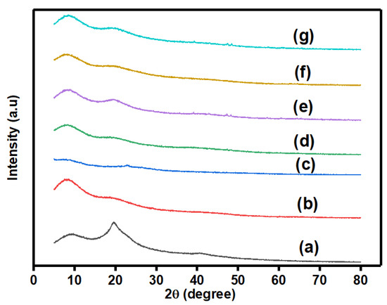 XRD diffractograms of (a) PVA, (b) (PVA/Agar)/H2SO4 hydrogel electrolyte, (c) PANI/PPy, (d) PAP1, (e) PAP2, (f) PAP3, and (g) PAP4.