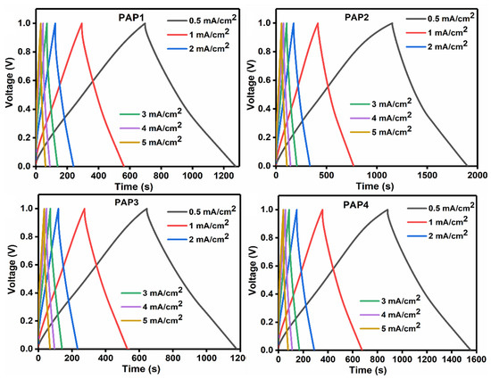 Galvanostatic charge-discharge (GCD) is a standard technique to study the electrochemical behavior and the cycle life of energy storage devices based on hydrogel electrolytes, by varying the currents. The device performance, therefore, was further studied by carrying out the galvanic charge-discharge (GCD) studies at different current densities ranging from 0.5 mA/cm2 to 5 mA/cm2. The results of the GCD studies are shown in Figure 11.