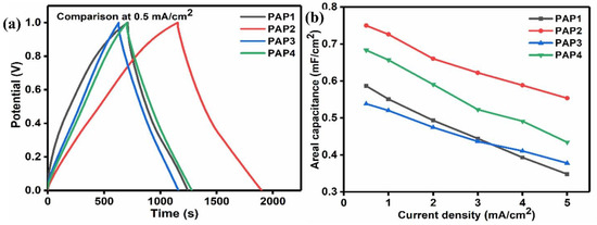 (a) Comparison of GCD curves at 0.5 mA/cm2, (b) areal capacitance vs. current density.