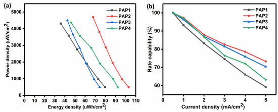 Figure 13a represents the Ragone plot of the calculated power density versus the calculated energy density of all the samples. PAP2 delivered higher power density and energy density as compared to the other samples. By comparing PAP2 and PAP4, as both of them contain 3 mL Agar, we can see a clear difference in the energy density and power density. This difference is attributed to the in situ grown conducting polymer electrodes. The fact is that the best sample which is PAP2 contains 5mL of PANI and PPy each which improves the charge conductivity, while PAP4 contains 2.5 mL PANI and PPy each. Table 2 presents the maximum areal capacitance values, energy density, power density, and rate capability of all the samples that were obtained.