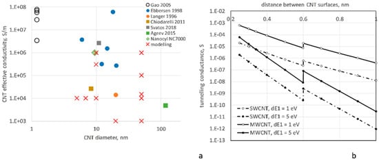 Uncertainty in electrical conductivity input data: (a) experimental data on intrinsic CNT conductivity, SWCNT (open symbols []), and MWCNT (filled symbols [,,,,,]); round points: experiments with single CNTs; squares: experiments with aligned CNTs; diamond: manufacturer’s datasheet; crosses: input data used in various modelling works; (b) tunneling conductance of a contact between two CNTs in function of the distance between them; results for SWCNTs and MWCNTs are calculated with Equations (2)–(4).