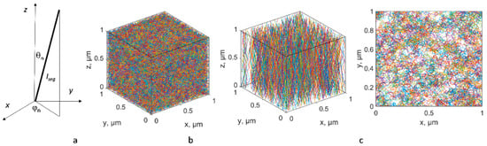 The algorithm generating the geometrical model is described in [,] and is illustrated in Figure 2. It uses random choice of the direction of a generated CNT path segment, as is widely used in the literature, for example, in [,], but with certain constraints, as described below. Figure 2a shows a scheme of the nth segment of a CNT with length lseg, and orientation defined by the azimuthal angle φn and polar angle θn. To generate the aligned assembly, the angles φn and θn are defined in relation to the global Cartesian coordinate system of the assembly with axis z corresponding to the direction of forest growth. For generation of a random assembly, the angles are defined in the local coordinate system with axis z corresponding to the direction of the previous segment, where the first segment was oriented according to the uniform orientation distribution. The angles φn and θn are random values. They are first calculated as φn = rand(0,2π), cosθn = randN(1, cos(σθ)), where rand(a,b) is a random generator of the uniform distribution on [a,b], randN(a, σ) is a random generator of the normal distribution with mean a and standard deviation σ, and σθ is a characteristic polar angle deviation, which is calculated based on the length of the CNT segment and the maximal curvature. The randomness of segment orientation is restricted by the following conditions: