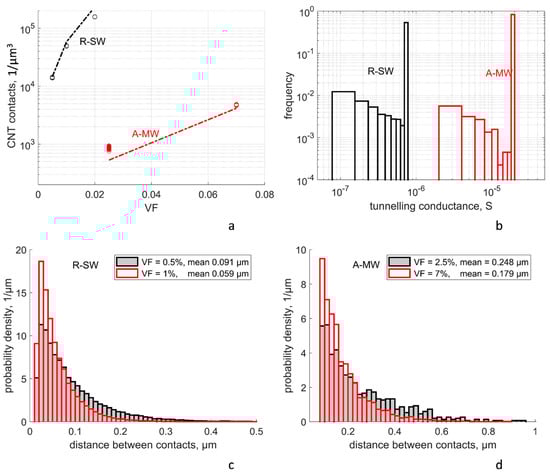 Characteristics of contacts for random RVEs: (a) density of CNT contacts, points: calculated values for random RVEs (the scatter is not noticeable for R-SW), lines: prediction according to Equation (8); (b) distribution of the tunneling conductances of CNT contacts, ΔE1 = 3 eV, smin = 0.34 nm, typical RVEs for R-SW (VF = 1%) and A-MW (VF = 7%) cases; (c,d) distribution of distances along CNTs between the contacts for R-SW (c) and A-MW (d) cases; mean values are shown in the legends.