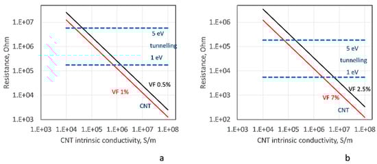 Theoretically, the resistances of an ideal single-walled CNT (SWCNT) and a multi-walled CNT (MWCNT) are quantum (the so-called ballistic electron transport) which do not depend on the length of the conductive segment if this length is smaller than the mean free path of electrons. The latter is theoretically estimated as ~1 µm for SWCNTs and tens of micrometers for MWCNTs []. The typical distance b between CNT contacts along a CNT in a random CNT assembly can be estimated as [,], where d is the CNT diameter, and Vf is the volume fraction. For typical values d ~ 0.01 µm and Vf ~ 0.01, this equation gives b ~ 0.5 µm, which is shorter than 1 µm of the free path. This suggests that the conductivity along CNT segments between two contact points should be taken as ballistic, and there exist experimental data supporting this statement [,,]. However, the reliability of these measurements has been strongly criticized. Studies [,] argued that the used liquid–metal contact method gives “false positive” results for the ballistic nature of conductance. The theory of quantum resistance assumes the absence of the CNT structural defects. This assumption, although better justified on nano-scale than on macro-scale, still oversimplifies the description of the reality since CNT defects are experimentally observed and well-studied [,,]. The presence of defects causes electron scattering and, thereby, the degradation of their mean free path length. For example, in [] the mean free path length in MWCNTs was measured to be just 4.7 nm, which is a thousand times shorter than the theoretically suggested value for the ideal defect-free case. The authors of [] suggested that the presence of defects cause a diffusive, Ohmic type of resistance, linearly increasing with the increase in the length of a conducting segment.