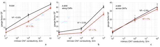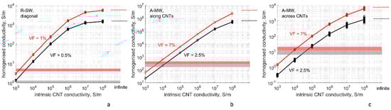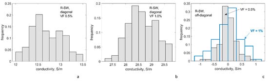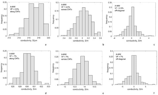 Using the algorithm described in Section 3, the RVE sets are generated for R-SW and A-MW input data: 33 RVE instances of R-SW and 100 of A-MW. Examples of the RVEs are shown in Figure 2b,c. Potential differences are applied to all pairs on the opposite RVE faces in a sequence. After homogenized conductivity is calculated, this produces 99 independent values for principal conductivity tensor components for isotropic R-SW (33 RVE instances times 3 directions of the potential difference application), 100 and 200 independent values for Z-conductivity and X/Y-conductivity, respectively, for transversely isotropic A-MW, with Z being the direction of the CNT alignment.