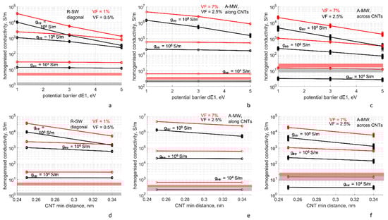 The mean inter-contact CNT resistance is calculated inverting Equation (1) with lseg = bmean, where bmean is the mean distance between two contacts along a CNT. The results of these calculations are plotted in Figure 4 (solid lines) as a dependency for R-SW and A-MW cases, respectively. The levels for the tunneling resistance , which is an inversion of the tunneling conductance given by Equations (2) and (3), are plotted on the same graphs for the range of ΔE1 = 1–5 eV and the minimal distance between the CNT surfaces of 0.34 nm (which corresponds to the overwhelming portion of the contacts, see Figure 3b). Depending on the gintr value, the relation between two resistances can be different. For gintr ~ 104 S/m, , and the CNT, intrinsic resistance defines the homogenized resistivity/conductivity. On the other end of the studied range, for gintr ~ 108 S/m, we have , and the tunneling resistance is the defining factor. In the middle of the gintr range, both resistances are comparable.