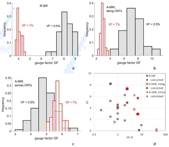 The range of GF values found in the literature is very wide. Review [] and later publications, e.g., [,], provide the following data. For non-aligned CNT distributions, with weight percentage of CNT below 2%, the most often observed values are in the range 1–7. Some authors give GFs up to 20–30 [,]. For aligned CNTs, the range of GFs for deformation in the direction of the CNT alignment is 0.04–10.
