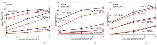 Hypothesizing that the main contribution to the tunneling part of conductivity comes from distances shorter than the polymer cutoff distance (which will be proved later by Figure 3b), we can assume the value of in Equation (6) as being determined by ΔE1 = 4.5 eV, i.e., τ ~ 22 nm−1. For distances s between 0.34 and 0.6 nm and with ε = 0.01, we expect Equation (6) to be in the range from 0.87–0.93 with the GF of the tunneling part to be in the range from 7 to 13. This is the total GF in case of infinite intrinsic conductivity. For non-zero intrinsic resistivity, the GF will be lower. These values correspond to the experimental observations.