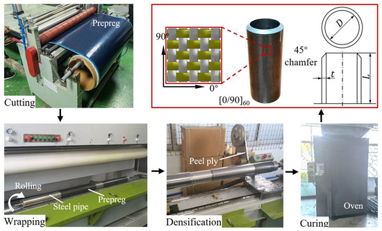 Figure 1 also presents the fabrication process of circular CFRP tubes, which comprises the following steps: (i) cutting the prepreg into pieces with proper dimensions, (ii) wrapping the prepreg around a circular steel pipe with a diameter of 100 mm, (iii) eliminating potential voids (densification) by overwrapping the stacked prepregs with a peel ply, (iv) curing in an oven at a temperature of 150 °C for 3 hours, and (v) cooling down and demolding. Finally, specimens with a thickness (t) of 12.4 mm are cut from the cured tubes.