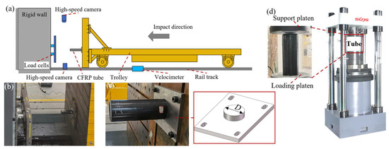 Dynamic crushing tests of the CFRP specimens were carried out at CRRC Changchun Railway Vehicles Co., Ltd., Changchun, China. Figure 2a presents the layout schematic, which consists mainly of a trolley, rigid wall, high-speed cameras, velocimeter, and rail track. During the test process, a trolley with a mass of 18.19 t was powered to an initial velocity of 1.944 m/s before coming in contact with the rigid wall along the railway track (Figure 2b). The specimen was installed on a trolley using a mounting device (Figure 2c). A velocimeter was used to obtain the actual impact speed of the trolley. High-speed cameras were placed at the top and side of the trolley to record the deformation and failure processes of the specimen. The instantaneous crushing force data were recorded by the load cells after the specimen contacted the platen, which was assembled on the rigid wall.