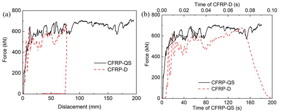 - Under quasi-static and dynamic axial impact loads, the circular CFRP tubes exhibited a stable crushing response. However, the values of MCF and SEA under dynamic crushing loads were 485.7 kN and 78.7 kJ/kg, respectively, showing the same 21.8% reduction compared to the quasi-static cases.