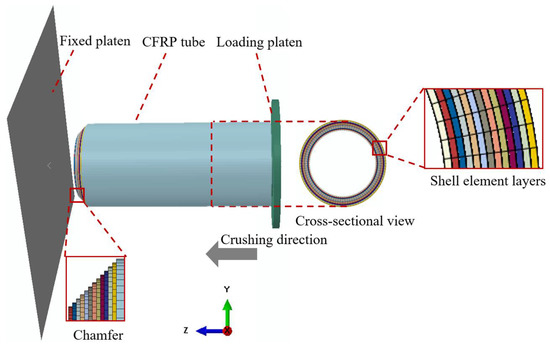Crashworthiness simulations of the composite tubes subjected to axial crushing loads were performed using the commercial software ABAQUS 6.13-4. Figure 6 illustrates the established FE model comprising a fixed platen, loading platen, and composite tube. The fixed and loading platens were separately set as rigid bodies with no deformation during the crushing process. The CFRP tubes were modeled using the classical stacked-shell strategy, where all the composite plies were represented using several layers of shell elements (S4) connected to the cohesive contact. A 45° chamfer was realized by adjusting the lengths of the different shell layers. As reported in the literature [31,46], a fine mesh size (less than 2 × 2 mm) and sufficient shell layers (equal to the real ply number) are required to simulate the crushing response of CFRP structures precisely. Because the ply number is up to 60 in this study, these practices could lead to unacceptable modeling and computational costs. Therefore, considering the influence of the number of shell layers is necessary, as described in Section 3.3.1.