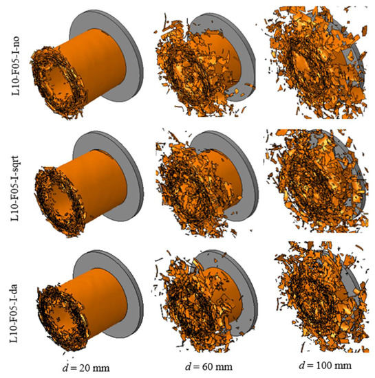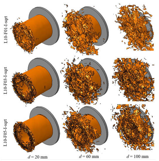 The composite tube was modeled using 10 layers of shell elements with the same friction coefficient of 0.5. Three different pairs of values for the inter-layer fracture energies and were examined, as shown in Table 3. The lowest values of and (L10-F05-I-no) are the original parameters listed in Table 2. For the other two tested configurations, the interface properties were amplified using scaling factors calculated using Equation (6) and Equation (7), respectively.