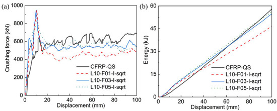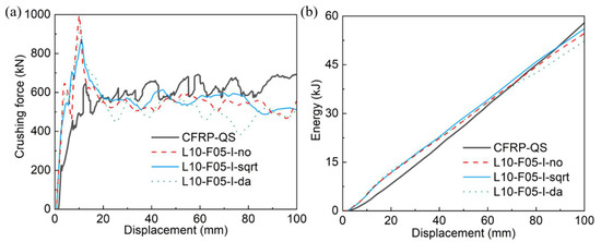 Comparisons of (a) crushing force–displacement curves and (b) energy–displacement curves between experimental (CFRP-QS) and simulated results using three pairs of inter-layer fracture energy values.