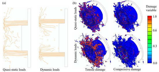 Figure 14a depicts a cross-sectional view of the composite tubes subjected to quasi-static and dynamic impact loads. A similar deformation mode was achieved from these two simulations: large amounts of fiber debris appeared in the central area between the loading platen and tube wall, and the crushed laminas were bent inward and outward of the tube wall along the loading direction. The curved fiber bundles suffered complicated deformation and damage processes, such as inter-layer delamination and tensile/compressive damage behavior (illustrated in Figure 14b). Increasing the loading velocity promoted a more stable load-carrying capability, which agreed well with the test results, as shown in Figure 3.