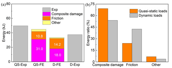 Figure 15 illustrates the comparison of different energy components among the quasi-static and dynamic simulations, including composite damage energy, friction energy, and others (caused by the calculation error of the FE software). It can be observed that the energies dissipated by the composite damage and friction effect were 31.0 kJ and 10.8 kJ, respectively, under quasi-static loads. These were 69.1% and 24.1% of the total energy, respectively. When the loading velocity increased, the composite damage energy and friction energy changed to 18.0 kJ and 14.2 kJ, which were 53.8% and 42.5% of the total energy, respectively. This change explains the influence of the loading velocity on the reduction in total EA.