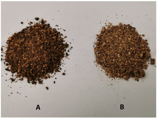 Figure 1. Solid waste of olive milling process (pomace), (A) before solvent extraction. (B) After solvent extraction.