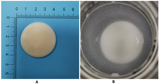 Figure 5. (A) Final polyanhydride sample after being melt-casted (4 mm thick) at 80 °C. (B) The polymer submersed in buffer solution (PH: 7.0).