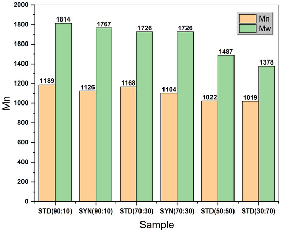 The molecular weight profile indicates a close correlation between sebacic acid concentration and molecular weight in both number average molecular weight and weight average molecular weight as shown in Figure 8. A relevant decrease in both M n and M w was observed when the concentration of sebacic acid was less than or equal to 50 wt% as shown by samples STD (50:50) and STD (30:70). Samples terminated with standard grade oleic acid have slightly higher M n than samples which were terminated from the olive waste extract. For instance, sample SYN (90:10) had M n of 1126 Da, while sample STD (90:10) exhibited a M n of 1189 (+63 Da). In contrast, for sample SYN (70:30) the M n was 1104 Da, while sample STD (70:30) had M n of 1168 (+63 Da). As these differences in both M n and M w can be attributed to many factors, such as the purity and nature of the termination fatty acids, the ratio between the fatty acids and acetic anhydride, the reaction temperature and time, the most plausible explanation is the effect of the non-oleic fraction (12%) in the samples which were prepared from olive waste. This is because all samples were prepared under the same reaction temperature and time, and thus, the only varying factors were the concentration of oleic acid (10, 30, 50, 70 wt%) and the source of it (standard grade and the one extracted from the waste).