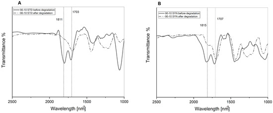 Figure 9. Degradation curves of samples: (A) STD (90:10); (B) SYN (90:10).