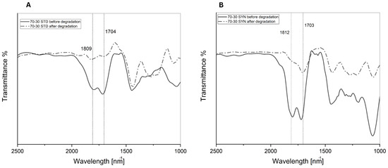 Figure 10. Degradation curves of samples: (A) STD (70:30); (B) SYN (70:30).