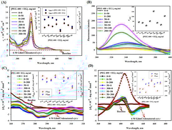 Proteins show various characteristic bands in their spectra such as absorption bands around 280 nm (due to the aromatic side chains of Tyr and Trp residues), the Soret band at 409–410 nm (due to the heme group), and oxy-deoxy tiny bands around the wavelength range of 500–600 nm provide information about the state of iron atoms (oxidized or reduced form) [,]. Figure 1 showed absorption spectra of the native cyt c (black) with a sharp Soret band around 409 nm []. The heme group placed inside the hydrophobic pocket of the folded protein and π-π* electron transitions occurring in the prosthetic group, resulting in an increase inthe peak in the Soret-region. The Soret band position and shape are solely dependent on the geometric position of their own atom with the heme [,]. A decrease in the intensity of the band (Soret region) without any shift in the wavelength in the presence of PEG 400 is greatest at 300 mg/mL, which reflects that protein structure is perturbed and heme environment changes towards the polar environment [,,]. This observation is in agreement with that reported previously []. EG alone has an insignificant increase in the absorbance at its both low and high concentrations. However, mixtures PEG 400 and EG caused variable changes in the heme environment. For example, a 1:1 ratio (PEG 400:EG) leads to an increase in absorbance without any shift in the wavelength, a concentration ratio of crowders 1:6 (PEG 400:EG) resulted in an increase in the absorbance with a blue shift, and 6:1 (PEG 400:EG) resulted decrease in the absorbance, but less than that of PEG 400 alone, directs protein towards the native state. There was no change in the oxy-deoxy band (500–600 nm) in the presence of crowders alone or their mixtures, indicating that the protein was oxidized under all these conditions. Moreover, change in Trp and Tyr environments monitored by ε280, occurred from non-polar to polar environment in the presence of PEG 400 alone showed decrease in absorbance, which is comparable to cyt c denatured spectrum (6 M GdmCl-induced state). However, in the presence of mixtures (PEG 400 + EG) absorbance (ε280) increases which is contrary to that of the denatured cyt c (Figure 1A). Figure 1B showed an increase in the fluorescence intensity of the protein in the presence of PEG 400 alone, which showed that the energy transfer occurs from Trp to heme results in a change in the distance between heme and Trp. Quenched Trp changes its non-polar environment towards polar, resulting in an increase in the intensity []. On the contrary, the fluorescence intensity of the protein decreases in the presence of EG, which in earlier report was confirmed that EG acts as a quencher as the concentration is increased []. EG and cyt c showed weak interaction and it has been observed that EG acts as kosmotroph (which maintains the conformation of the protein) []. However, the mixture of these crowders at all ratios resulted in a decrease in the fluorescence intensity as compared to PEG 400 alone. Furthermore, in support of the absorbance and fluorescence studies, near-UV and Soret CD measurements (Figure 1C,D) showed that PEG 400 has a significant effect on the environment of aromatic residues (Met80 and Phe82) and heme interactions with protein globule. EG has no significant effect on such intra-molecular interactions (heme with globule, Met80, and Phe82), and mixture (PEG 400 + EG) caused a perturbation of the tertiary structure, but was less than that of PEG 400 alone.