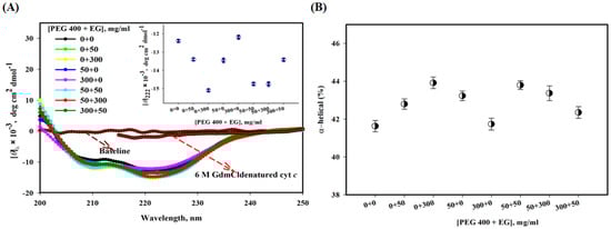 (A) Far-UV CD spectra of cyt c with different [PEG 400 + EG], and 6 M GdmCl at pH 7.0 and 25 °C.The inset of the figure displays a plot of [θ]222 versus [PEG 400 + EG]. (B) α-helical content of cyt c in the presence of mixtures of crowders.