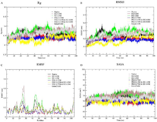 Panels A, B, C, and D of Figure 3, respectively, show plots of radius of gyration (Rg), root mean square deviation (RMSD), root mean square fluctuation (RMSF), and solvent accessible surface area (SASA) of cyt c in various conditions; water (black), 50 and 300 mg/mL (0.8 and 4.8 M) of EG (Red and green), 300 mg/mL (0.75 M) PEG 400 (blue), two PEG 400 + EG mixtures, 50 + 300 mg/mL (yellow) and 50 + 300 mg/mL (brown), and 6 M GdmCl (grey). Rg measurements provide information on the opening of protein structure as it indicates the axial scattering of the atoms of the center of mass of the protein []. Table 2 provides the change in the values of Rg, RMSD, RMSF, and SASA of the protein in the absence and presence of EG, PEG 400, mixtures of (PEG 400 + EG) and 6 M GdmCl.