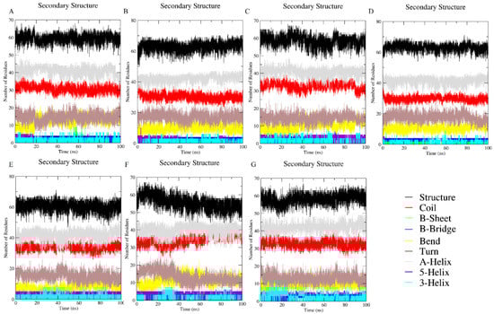 For the secondary structural analysis, changes in the ratio of secondary structural components in response to the solvent effects can be seen in Figure 4; (Figure 4A) the native state in water, (Figure 4B,C) EG with 50 and 300 mg/mL (0.8 and 4.8 M), respectively, (Figure 4D) 300 mg/mL (0.75 M) of PEG 400, (Figure 4E) 300 + 50 mg/mL (0.75 M + 0.8 M) mixture of PEG 400 + EG, (Figure 4F) 50 + 300 mg/mL (0.125 M + 4.8 M) mixture of PEG 400 + EG, and (Figure 4G) 6 M GdmCl. The percentage of secondary structure elements of the protein and protein under co-solute conditions (individual and mixture) were not changed. Figure 4 shows the secondary structure of the protein is neither affected by PEG 400 nor EG alone nor in the presence of mixture of crowders. Moreover, the MD simulation of protein in the presence of 6 M GdmCl (Figure 4G) shows a depth at initial time (15–30 s), however the secondary structure was not affected by GdmCl either to that extent (see Figure 4).