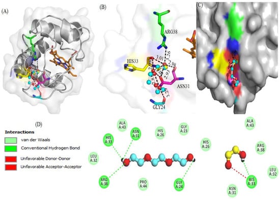 Figure 5 displays the interaction of PEG 400 and EG with cyt c via non-covalent forces without interacting with the heme. Figure 5A provides a cartoon model of the protein (gray) and ball and stick pattern of PEG 400 (blue) and EG (yellow) and shows ligand interactions with various amino acid residues of the receptor. Figure 5B provides the bond distances generated between ligands (PEG 400 and EG) and the protein, in which PEG 400 interacts Arg38, His33 and Gly24 via single bonds of distance 3.26, 2.95, and 3.29 Å, respectively. Asn31 interacted via more than two bonds with distances of 2.81, 3.01 and 2.93 Å. EG interacts with His33 via two bonds with distances of 3.01 and 2.98 Å, and Asn31 via a single bond of distance 2.98 Å. Figure 5C displays the surface image of the protein (cyt c) with binding pocket sites for PEG 400 and EG. PEG 400 and EG interact with the amino acid residues of the protein via non-covalent interactions (conventional H-bonding, vander Waals forces, unfavorable accepter-accepter, and unfavorable donor-donor bonds) as seen in the 2D-structure of the model in Figure 5D. Due to the binding of PEG 400 and EG with cyt c, the computational study gives binding energies of −3.3 and −2.7 kcal mol−1, respectively.