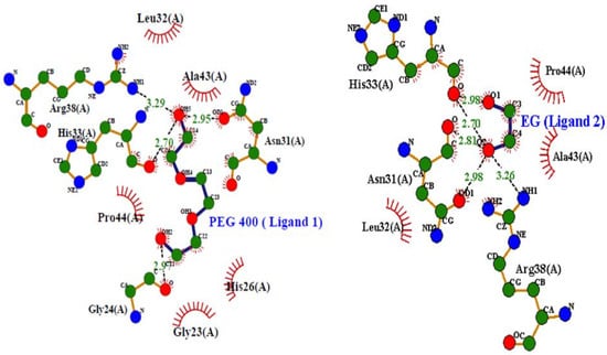 Figure 6 shows interactions (hydrogen bonding, hydrophobic, etc.) between various residues of cyt c with both PEG 400 and EG were further demonstrated using LigPlot (a programmed software that automatically generates schematic diagrams of protein-ligand interactions for a given PDB file).