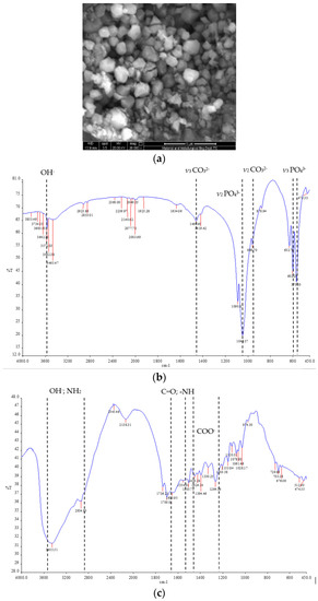 The results of the SEM identification show that the resulting pellet has a hexagonal particle shape with a particle size mean of 1.350 ± 0.243 μm (Mean ± SD) (Figure 1a). The results of the FT-IR from BHA describe the percentage of transmission at the specific wave numbers PO4 = 1048.57 cm−1, OH = 3571.03 cm−1, and CO3 = 1460.65 cm−1, which are the harsh characteristics of bovine hydroxyapatite. Meanwhile, the result of the assessment in gelatin describe the emergence of the percentage of transmission in OH; NH2; = 3500–3000 cm−1; C=O and NH = 1655–1540 cm−1; COO = 1450–1240 cm−1 (Figure 1b–d).