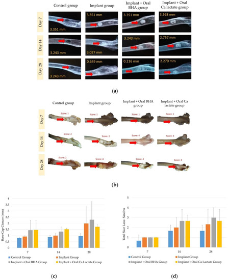 A study on the effect of oral BHA or calcium lactate on the repair of bone defects, implanted with BHA–GEL pellets, was carried out using a burr hole defect model in the cortical bone of the rabbit femur. Defects with implants appear circular, with higher intensity than their surroundings. The radiographic results showed that the implant group experienced accelerated bone growth in the area of the defect compared to the group without implants. The pellet intensity in the implant + oral BHA group was known to be fainter than that in the implant + oral calcium lactate group (Figure 2a,b), indicating the union of bone with the composite. The results of the evaluation of bone gap closure-obtained data that were not normally distributed (p < 0.05) nor homogeneous (p < 0.05) in the termination group on days 7, 14 and 28. Furthermore, using the Kruskal–Wallis, it was found that there was no difference which was significant (p > 0.05) between groups for each termination period (Figure 2c). The development of bone regeneration can also be known based on callus formation, which is characterized by changes in the intensity and transformation of the implants implanted. The longer treatment times showed the intensity of the pellets was fading, but the radiological results did not describe the percentage of callus growth so that it was continued with macroscopic observations. Lane–Sandhu scoring results (macroscopic observation) showed that the longer the treatment time, the higher the percentage of callus growth. The data generated from the scoring process includes non-parametric data so that the test carried out is Kruskal–Wallis and shows a sig. value (p > 0.05), or there is no significant difference between groups in each termination period (Figure 2d).